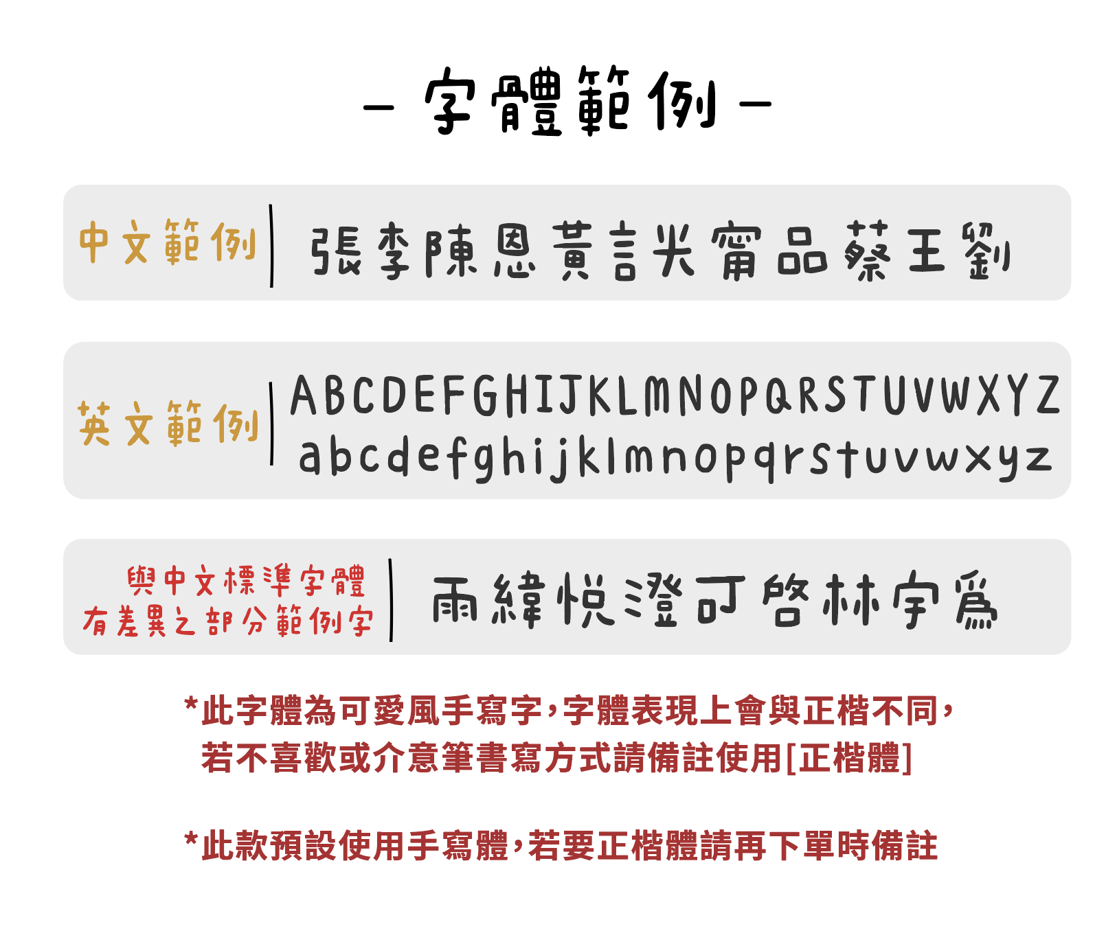 *注意!統一使用手寫字體,若遇生僻字無法呈現將直接用"正楷體"